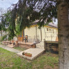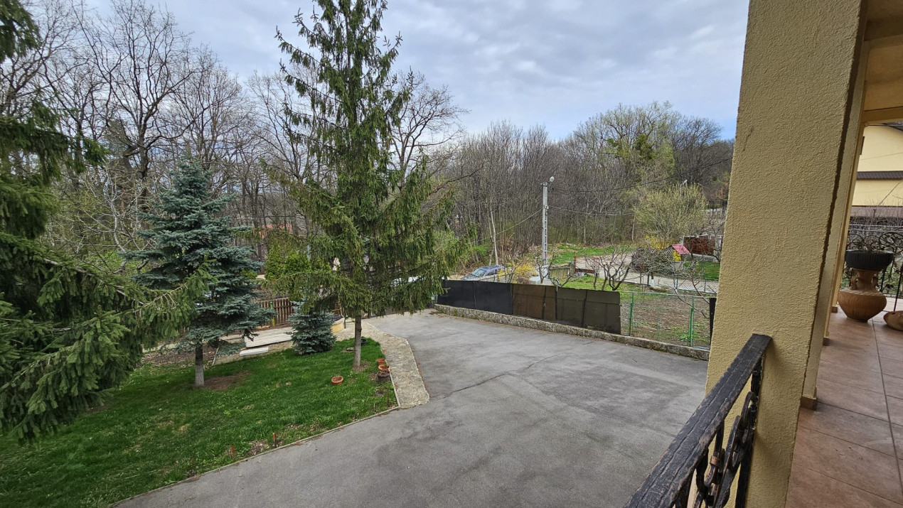 * curte amenajată cu brazi, arbori ornamentali și vegetație matură